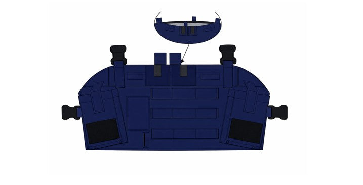 Vest/bryststykke: Brukes for rigg av 1-2 samband, INVISIO kontrollenhet V10 eller V60, evt ekstern stor PTT, og kabler til radio. Leveres i blå farge (røykdykkere), og gul/rød for identifikasjon av RDL og IL/O1